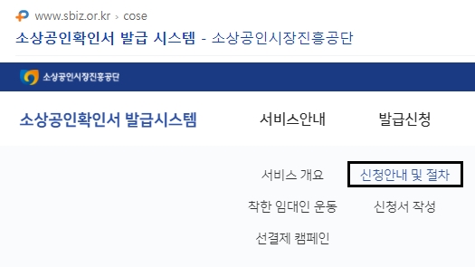 일단 해당 서비스를 제공하는 사이트에 접속해서 관련 메뉴를 찾아보겠습니다. 메인화면 상단에 있는 [발급신청] 메뉴를 눌러서 [신청안내 및 절차] 항목을 선택합니다.