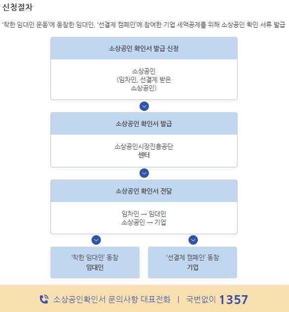 신청절차는 착한 임대인 운동에 동참한 임대인, 선결제 캠페인에 참여한 기업 세액공제를 위해서 소상공인 확인 서류를 발급합니다. 확인서 발급을 신청하고 발급을 받으면 확인서를 전달합니다. 상세 절차는 위의 표를 참고하시구요, 더 궁금한 사항이 있거나 문의사항이 있으시면 국번없이 1357로 연락하시기 바랍니다.