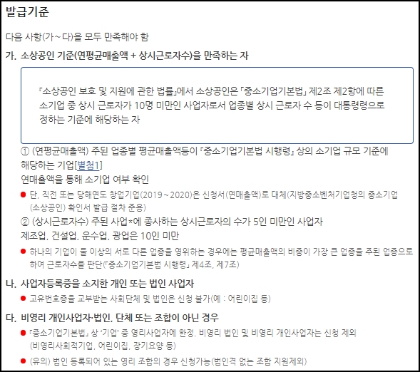 소상공인확인서 발급 기준은 세가지를 명시하고 있는데요, 그 세가지를 모두 만족해야 한다고 합니다. 첫번째는 소상공인 기준을 만족해야 하는데요, 여기에는 연평균매출액과 상시근로자수가 포함됩니다. 두번째는 사업자등록증을 소지한 개인 또는 법인사업자여야 합니다. 세번째는 비영리 개인사업자/법인 및 단체 또는 조합이 아닌 경우여야 합니다.