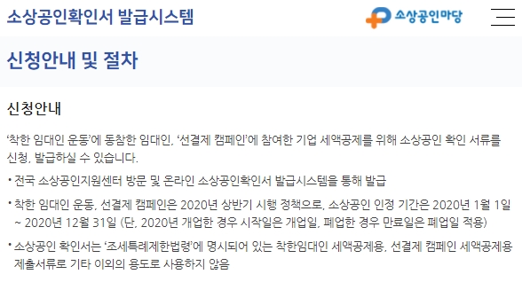 착한 임대인 운동에 동참한 임대인 및 선결제 캠페인에 참여한 기업 세액공제를 위하여 소상공인 확인서류를 신청 및 발급할 수 있습니다. 소상공인 확인서는