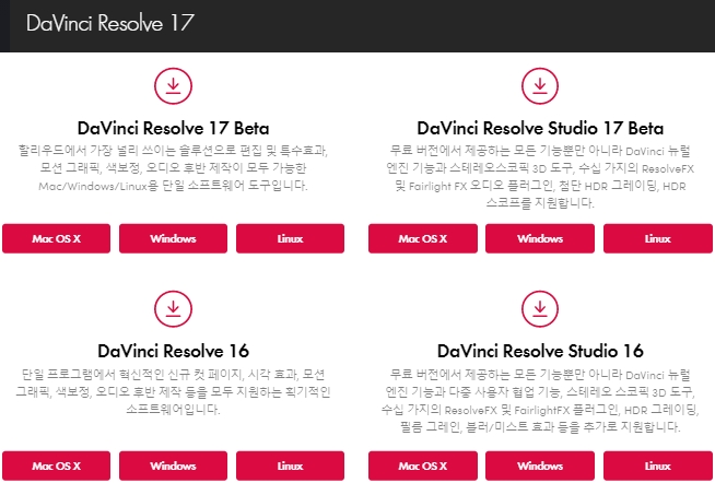 그러면 다빈치 리졸브 다운로드 제공 버전들을 보겠습니다. 현재 네가지가 있는데요 각각은 16, 스튜디오16, 17베타, 스튜디오17베타입니다. 프로그램에 대한 간단한 설명이 나와있으니 원하는 버전을 고르시면 되겠습니다. 지원하는 운영체제는 맥, 윈도우즈, 리눅스입니다. 아마 대부분의 사람들이 윈도우를 선택할 것 같네요.