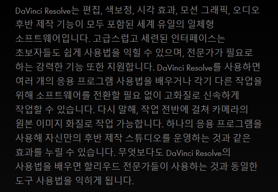 오늘은 Da Vinci Resolve 또는 다빈치 리졸브 다운로드하는 방법에 대해서 알아보도록 하겠습니다. 해당 프로그램은 블랙매직 디자인사에서 만든 실시간 및 타임라인 기반의 영상편집, 컬러 그레이딩 소프트웨어입니다. 윈도우, 맥, 리눅스 운영체제를 지원하며 현재 할리우드에서 제작되는 대부분의 영화들은 이 소프트웨어를 이용하여 색보정 작업을 합니다.