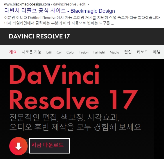 저에게는 사실 다소 생소한 프로그램이긴 한데요, 영상관련 작업을 자주 하시는 분들에게는 익숙할 것 같네요. 그럼 먼저 공식 사이트를 찾아서 접속해보겠습니다. Google 검색을 활용했으며, 접속 후 메인화면의 모습은 위의 그림과 같습니다. 전문적인 편집, 색보정, 시각효과, 오디오 후반제작을 모두 경험할 수 있습니다.