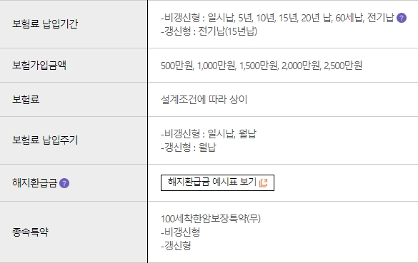 보험료 납입기간도 비갱신형과 갱신형으로 구분되어 있으며, 가입금액은 500만원부터 2500만원까지 있습니다. 보험료는 설계조건에 따라서 상이하며, 납입주기는 비갱신형은 일시납과 월납 그리고 갱신형은 월납입니다. 해지환급금 예시표와 종속특약에 대해서도 확인이 가능합니다.
