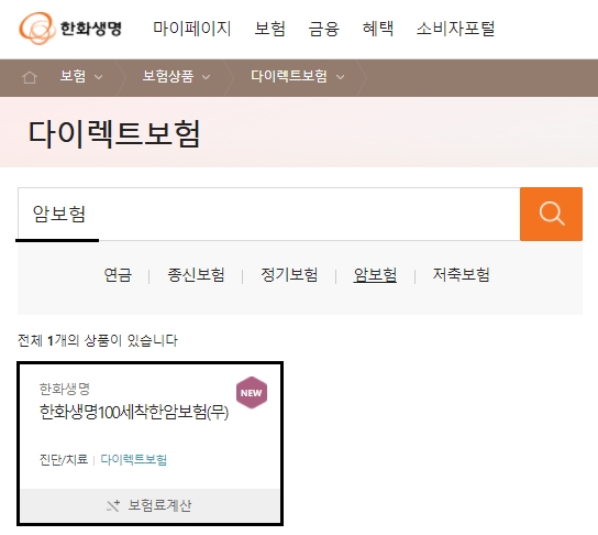 한화생명 홈페이지에 접속하여 보험상품 메뉴를 선택합니다. 또는 검색창에다가 위의 그림처럼 키워드를 잡고 검색하시면 총 1개의 상품을 찾을 수 있습니다. 100세착한암보험이며, 보험료계산을 해볼수도 있어요.