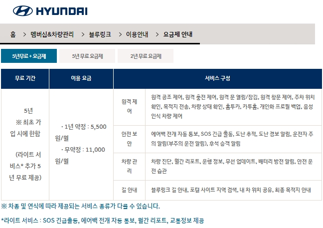 이번시간에는 현대 블루링크 요금에 대하여 알아보려고 하는데요, 크게 세가지 요금제로 구분하여 안내하고 있습니다. 먼저 5년무료 + 요금제는 최초 가입시 5년간 무료이고, 라이트 서비스의 경우 추가 5년이 무료제공됩니다. 이용요금은 1년약정을 하면 한달에 5500원이고, 무약정으로는 한달에 11000원을 내야합니다.