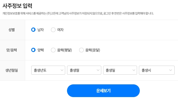 사주정보에는 성별, 양/음력, 생년월일을 입력할 수 있습니다. 정확하게 정보를 입력하고 [운세보기] 버튼을 눌러서 결과를 확인해보세요. 개인정보보호를 위하여 서비스를 제공하는 고든에 고객의 사주정보가 저장되지 않기에, 로그인 후 한번은 사주정보를 입력하셔야 합니다.