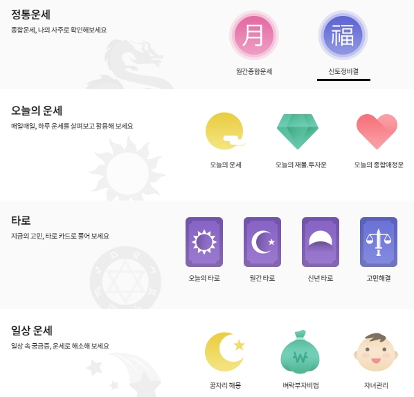 타로에서는 오늘, 월간, 신년타로 및 고민해결을 할 수 있으며 일상운세에서는 꿈자리해몽과 벼락부자비법 및 자녀관리 서비스를 이용해볼 수 있습니다.