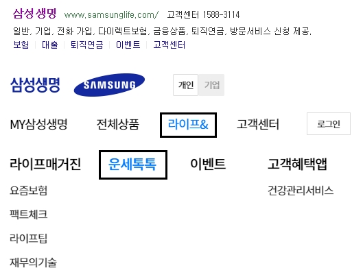 오늘은 삼성생명 토정비결 보는 방법을 준비해보았습니다. 무료 사주팔자 보기가 가능하기때문에 저를 포함한 여러분들도 부담없이 이용할 수 있을거라고 생각합니다. 해당 보험사 홈페이지에 접속해서 메인화면 상단에 있는 [라이프&] 메뉴를 선택합니다. 그리고 [운세톡톡] 항목을 눌러서 들어가시면 되겠습니다.