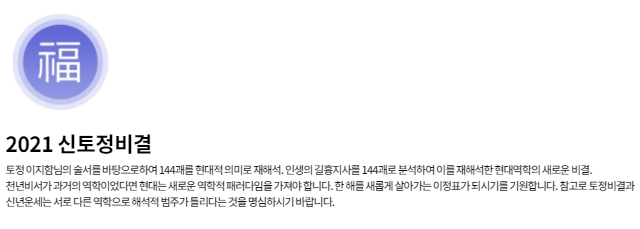 그럼 저도 올해의 신토정비결을 보도록 하겠습니다. 토정이지함의 술서를 바탕으로 하여 144괘를 현대적 의미로 재해석했으며, 인생의 길흉지사를 144괘로 분석하여 이를 재해석한 현대역학의 새로운 비결입니다. 천년비서가 과거의 역학이었다면 현대는 새로운 역학적 패러다임을 가져야 하는데요, 한 해를 새롭게 살아가는 이정표가 되기를 기원하고 있습니다.