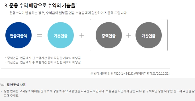 운용수익이 발생할 경우 수익금의 일부를 연금 수령금액에 합산할 수 있습니다. 연금지급액은 기본연금에 증액 및 가산연금을 더하여 계산합니다. 증액연금은 연금개시 전 보험기간 중 적립한 계약자 배당금이고, 가산연금은 연금개시 후 보험기간 중 적립한 계약자 배당금입니다. 상품안내는 고객의 이해를 돕기 위하여 상품의 주요 내용만을 요약한 자료이므로, 보험금을 지급하지 않는 사유 등 구체적인 상품 내용은 반드시 약관을 참고하시기 바랍니다.