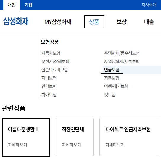 삼성화재 홈페이지에 접속하여, 메인화면 상단에 있는 [상품] 메뉴를 선택합니다. 그리고 하위항목들 중에서 [보험상품] 영역에 있는 [연금보험] 항목을 눌러주세요. 새롭게 뜨는 페이지에서 [관련상품] 영역의 [아름다운생활2] 항목을 선택하여 해당 상품에 대한 상세내용을 확인할 수 있습니다.