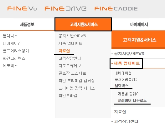 메인화면 상단에 있는 [고객지원&서비스] 메뉴를 선택합니다. [자료실] 항목을 눌러서 [제품 업데이트] 및 [블랙박스] 항목을 선택하고 [플레이어 다운로드] 항목을 눌러주세요.
