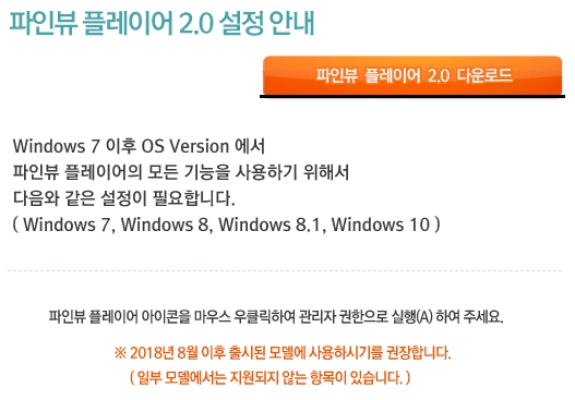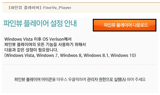먼저 오리지널 버전을 선택하여 상세페이지를 열어보겠습니다. [파인뷰 플레이어 다운로드] 버튼을 눌러서 받은 후 설치하여 실행할 수 있습니다. 윈도우 비스타 이후의 버전에서는 파인뷰 플레이어 아이콘을 마우스 우클릭하여 관리자 권한으로 실행해야 합니다.