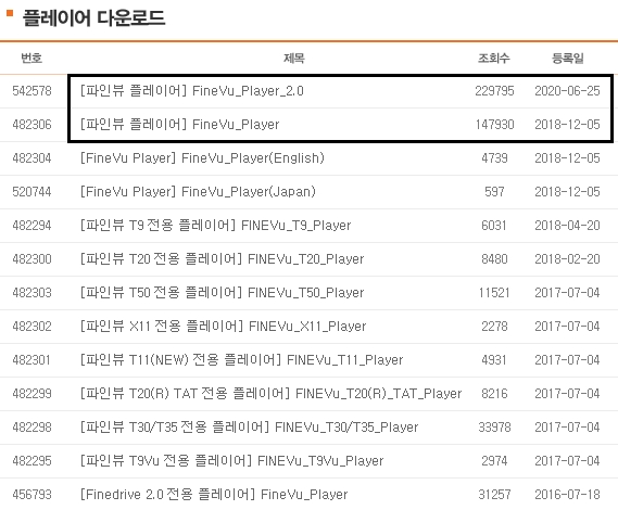 파인뷰에서 제공하는 플레이어들을 리스트의 형태로 모두 확인할 수 있습니다. 등록일 순으로 정렬되어 있으며, 가장 인기있는 프로그램은 FineVu_Player 및 2.0버전입니다. 조회수로 보자면 2.0버전이 더 인기있는 소프트웨어입니다.