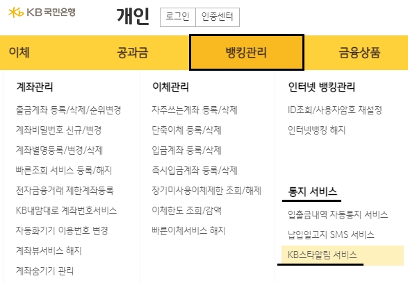 KB국민은행 홈페이지에 접속해서 메인화면 상단의 [뱅킹관리] 메뉴를 선택하고 [통지 서비스] 영역의 [KB스타알림 서비스] 항목을 눌러줍니다. 스마트기기에 설치된 어플리케이션을 통하여 푸쉬알림을 메시지를 통해서 입출금통지 및 금융정보 등을 무료로 실시간 제공하는 서비스입니다.
