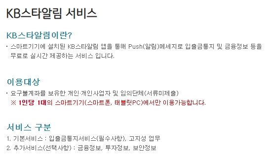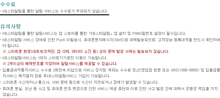 KB스타알림을 통한 알림서비스는 수수료가 부과되지 않으며, 유의사항은 위의 내용과 같습니다. 네트워크 차단, 앱 삭제, 데이터 소진 등 스마트폰 환경상의 문제발생시에는 알림이 발송되지 않으며 2개이상의 매체번호를 지정하여 알림서비스를 제공할 수 없습니다.