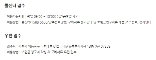 이용방법을 보시면, 콜센터로 연락하여 구비서류 문자안내 및 보험금청구서류 제출을 위한 팩스번호 문자안내를 받을 수 있다고 합니다. 팩스번호가 따로 홈페이지에 언급되어 있지는 않네요. 우편접수는 접수처 주소로 보내시면 되고, 보험금 청구서 작성 후 구비서류 우편접수를 하시면 됩니다.