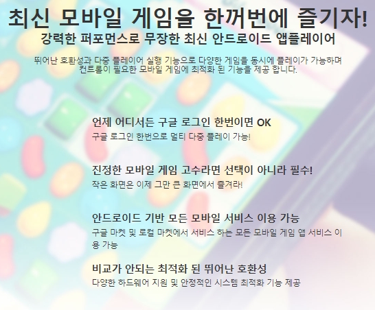 구글 마켓과 로컬 마켓에서 서비스하는 모든 모바일 게임 앱 서비스 이용이 가능하며, 다양한 하드웨어 지원과 안정적인 시스템 최적화 기능을 제공합니다.