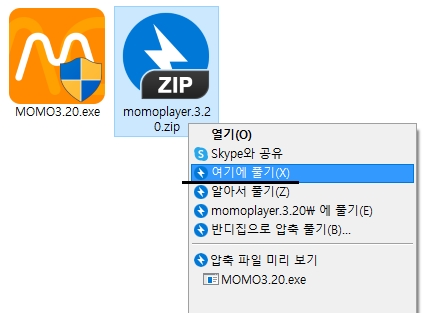 그럼 저도 momoplayer 파일을 다운받아 설치를 진행해보겠습니다. 현재시간을 기준으로 3.20버전을 제공하고 있는데, 추후에 버전업이 될수도 있습니다. 압축파일이기때문에 해당파일 위에 마우스 커서를 올려놓고 우클릭하여 풀기항목을 선택해서 압축을 풀어줍니다. 그리고 exe파일을 실행해주시면 됩니다.