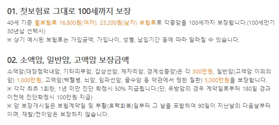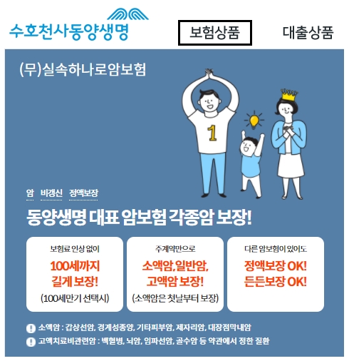 동양생명의 대표 암보험 상품이라고 하는데요, 100세만기 선택시 보험료 인상없이 100세까지 길게 보장하고 주계약만으로 소액암과 일반암 및 고액암을 보장합니다. 다른 암보험이 있어도 정액 및 든든보장을 한다고 하네요. 소액암은 갑상선암, 경계성종양, 기타피부암, 제자리암, 대장점막내암이고 고액치료비관련암은 백혈병, 뇌암, 임파선암, 골수암 등 약관에서 정한 질환입니다.