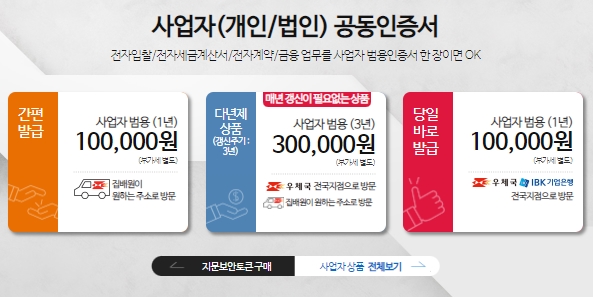 다년제 상품으로 3년짜리 인증서는 30만원이고, 전국 우체국 지점으로 방문하거나 집배원이 원하는 주소로 방문합니다. 당일 바로 발급할 수 있는 1년짜리 인증서는 10만원이고, 우체국이나 기업은행에 방문하여 신청할 수 있습니다.