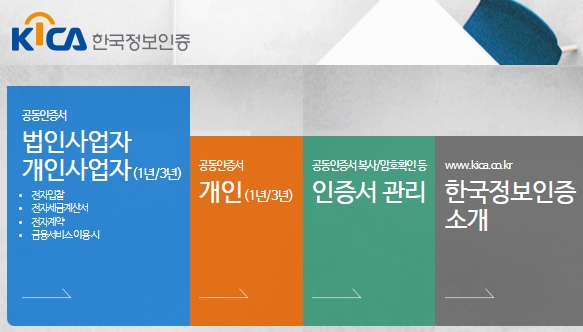 KICA 한국정보인증 메인화면의 모습은 위의 그림과 같습니다. 웹이나 인터넷검색 등을 활용하여 바로가기를 통할 수 있으며, 네가지 메뉴를 확인할 수 있습니다. 법인사업자와 개인사업자 공동인증서, 개인 공동인증서, 인증서 관리, 한국정보인증 소개 메뉴가 있으니 원하는 항목을 선택하여 열람해보시기 바랍니다.