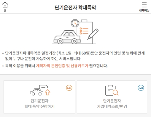 운전자의 연령이나 범위를 한정해서 자동차보험에 가입한 경우, 단기운전자확대특약을 통하여 일정기간을 설정하고 운전자의 연령 및 범위에 관계없이 누구나 운전이 가능하도록 할 수 있습니다.