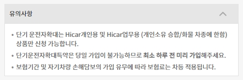 단기운전자확대는 하이카 개인용 및 업무용 상품만 신청할 수 있으며, 업무용은 개인소유 승합/화물 차종에 한합니다. 해당특약은 당일 가입이 불가능하기때문에 최소한 하루 전에는 미리 가입하셔야 합니다. 보험기간 및 자기차량 손해담보의 가입유무에 따라서 보험료가 차등 적용될 수 있습니다.