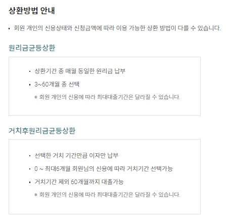 원리금균등상환은 상환기간 중 매월 동일한 원리금을 납부하고, 3~60개월 중 선택할 수 있습니다. 회원 개인의 신용에 따라서 최대대출기간이 달라질 수 있어요. 거치후원리금균등상환은 선택한 거치기간만큼 이자만 납부하고, 최대 6개월까지 회원의 신용에 따라서 거치기간을 선택할 수 있습니다. 거치기간을 제외하면 60개월까지 대출할 수 있어요.