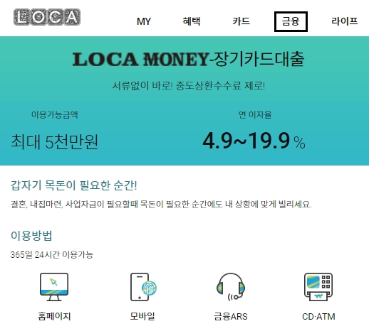 LOCA MONEY 또는 로카머니 장기카드대출 상품인 롯데카드 카드론에 대해서 알아보겠습니다. 홈페이지 메인화면 상단의 [금융] 메뉴를 선택하시면 되는데요, 서류없이 바로 신청할 수 있고 중도상환수수료도 없습니다. 이용가능금액은 최대 5000만원이고, 연이자율은 4.9%~19.9%까지입니다.