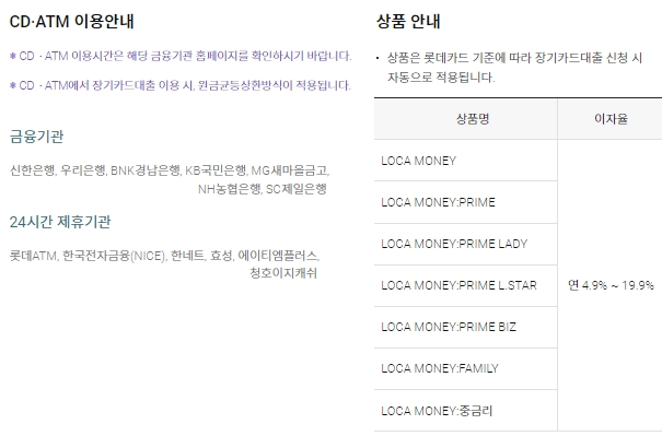 CD/ATM기 이용시간은 해당 금융기관 홈페이지를 확인해주시고, CD/ATM기에서 장기카드대출 이용시 원금균등상환방식이 적용됩니다. 금융기관과 24시 제휴기관에 대해서도 체크해보시구요,