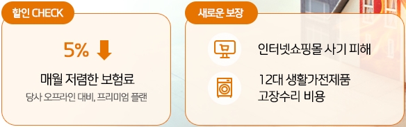 가전제품 수리비용도 보장하며 18대 가전제품 고장수리 비용 및 12대 생활가전제품 고장수리 비용을 포함합니다. 프리미엄 플랜 기준으로는 당사 오프라인과 대비하여 매월 5% 저렴한 보험료로 이용하실 수 있습니다.