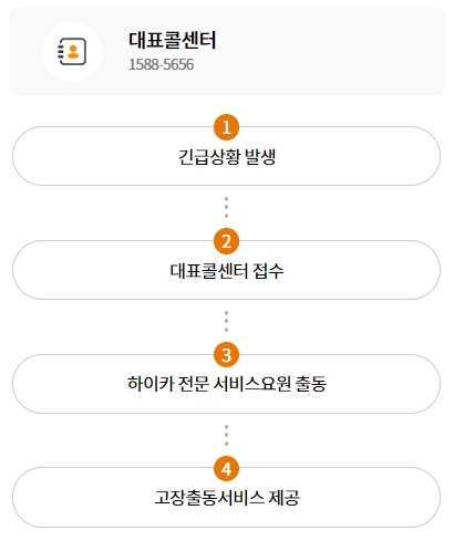 이용절차를 보시면 우선 대표콜센터인 1588-5656번으로 연락합니다. 그리고 긴급상황 발생 > 대표콜센터 접수 > 하이카 전문 서비스요원 출동 > 고장출동서비스 제공 순으로 진행됩니다.