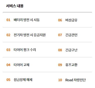 서비스 내용은 크게 10가지로 구분되어 있으며 각각은 배터리 방전시 시동, 전기차 방전시 응급지원, 타이어 펑크수리, 타이어 교체, 잠금장치 해제, 비상급유, 긴급견인, 긴급구난, 휴즈교환, Road 차량진단이 있습니다. 참고로 다이렉트 자동차보험, 운전자보험, 그 외 다이렉트보험 가입상담을 원하시면 하이카 다이렉트 고객센터 전화번호 1577-1001번으로 연락하시면 됩니다.