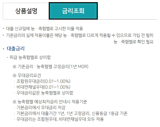 금리는 대출 신규일에 농/축협별로 고시한 이율을 적용하고, 기준금리의 실제 적용이율은 해당 농/축협별로 다르게 적용될 수 있습니다. 원금/이자상환의 경우, 대출 신규시 원하는 날짜로 결산일을 지정하여 매월 납입합니다.