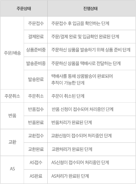주문한 상품의 배송상태는 화면 상단의 [주문/배송조회]에서 확인할 수 있으며, 주문상태별 주문의 진행현황은 위의 표를 참고하세요. 발송완료 단계에서는 배송추적기능을 통하여 택배사와 상품의 현재위치를 시간대별로 실시간으로 조회할 수 있습니다.