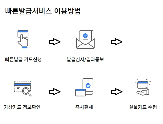 빠른발급 서비스는 카드신청 후 1시간 이내에 가상의 카드정보를 받아 안심클릭(일반결제)으로 온라인 결제가 가능한 서비스입니다. 이용절차는 빠른발급 카드신청 > 발급심사/결과통보 > 가상카드 정보확인 > 즉시결제 > 실물카드 수령 순입니다.