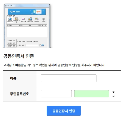 빠른발급 카드조회 메뉴로 들어가시면 이름과 주민등록번호를 입력하고 [공동인증서 인증] 버튼을 눌러서 공동인증서 인증으로 조회할 수 있습니다.