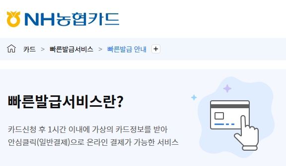 NH농협카드 홈페이지(NH농협카드(개인))에서 안내하는 빠른발급 서비스에 대하여 알아보도록 하겠습니다.