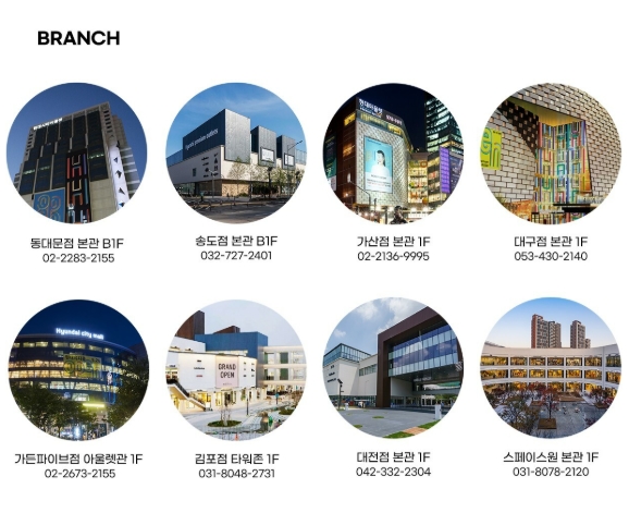 또한, 현대시티아울렛 가산점과 대구점에도 매장을 열어 오프라인 유통망을 지속적으로 확대하고 있습니다. 각 매장의 연락처 정보는 아래 그림을 참고하세요.