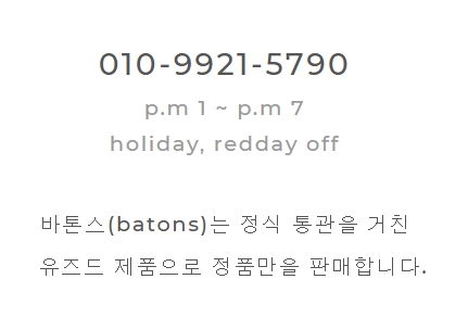 모니터 환경에 따라 실제 색상과 다소 차이가 있을 수 있으며, 상세 사이즈는 측정하는 범위에 따라 1~4cm정도 오차가 발생할 수 있습니다. 기타 바톤스 이용과 관련해서 문의사항이 있으시면 위의 그림에 나와있는 번호로 연락하시구요, 운영시간은 평일 13시~19시입니다.