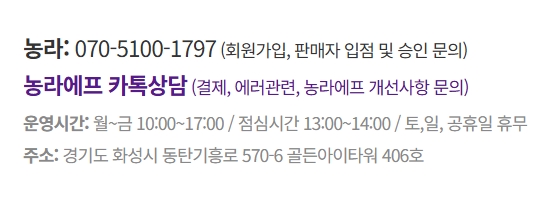 기타 농라에프 이용과 관련하여 문의사항이 있으시면 고객센터 070-5100-1797번 또는 카톡상담 서비스를 이용하세요. 운영시간은 평일 10시부터 17시까지, 점심시간은 13시부터 14시까지, 토요일/일요일/공휴일은 휴무입니다. 또한 회사 주소는 경기도 화성시 동탄기흥로 570-6 골든아이타워 406호입니다.