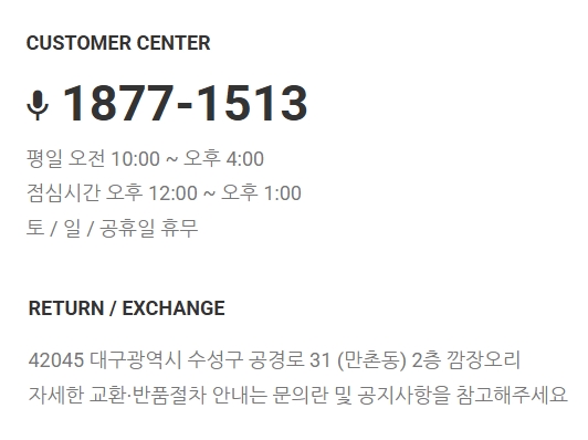 반품 및 교환시 주소는 (42045)대구광역시 수성구 공경로 31(만촌동) 2층 깜장오리이며, 자세한 교환/반품 절차에 대한 안내는 문의란 및 공지사항을 참고하세요.