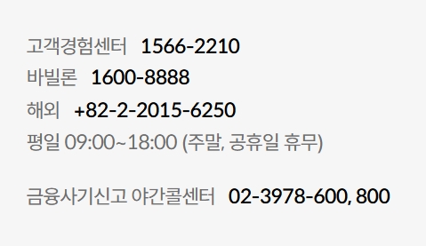 기타 문의사항이 있는 분들은 고객센터 1566-2210번, 바빌론 1600-8888번, 해외 +82-2-2015-6250번을 참고하세요. 운영시간은 평일 09:00~18:00(주말/공휴일 휴무)이고, 금융사기신고 야간콜센터는 02-3978-600/800번입니다.