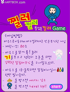 똥게임하기1 똥게임하기, 찔러찔러게임 똥게임하기, 찔러찔러게임 오늘은 약간 더러운 플래시를 하나 알려드리는데요, 혹시라도 점심이나 저녁을 드시기 전에는 가급적 이 게임을 삼가주세요 ㅋㅋ 똥침을찔러게임인데 위에서 똥을 싸대는 녀석에게 마구 똥침을 갈겨주시면 되는 게임입니다. 얼마나 정확하게 그리고 많이 갈기느냐가 관건입니다. 컨트롤은 마우스로만 합니다. 마우스의 움직임으로 캐릭을 동작하고 왼쪽 버튼으로 똥침 발사를 합니다. 그럼 더 자세한 똥게임하기 설명으로 들어가볼까요? 찔러찔러게임을 어떻게 하는건지 알아봅시다. 80초 내에 마구 찔러대주셔야되는데 똥을 싸는 녀석이 지쳐서 쓰러질때까지 갈겨주세요. 마우스 왼쩍 버튼을 이용하면 되는데 짧게짧게 누르면 일반 작은 똥침이 발사되고, 계속 누르고 있으면 기가 모아지면서 큰거 한방을 노릴 수 있어요 .. 2013. 12. 12. 이전 1 다음